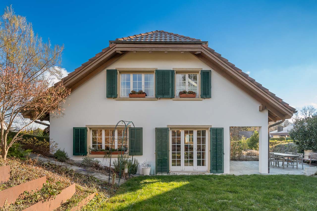 Immobilienfotografie - Einfamilienhaus - Bergdietikon, Aargau. Aussenaufnahme mit Garten