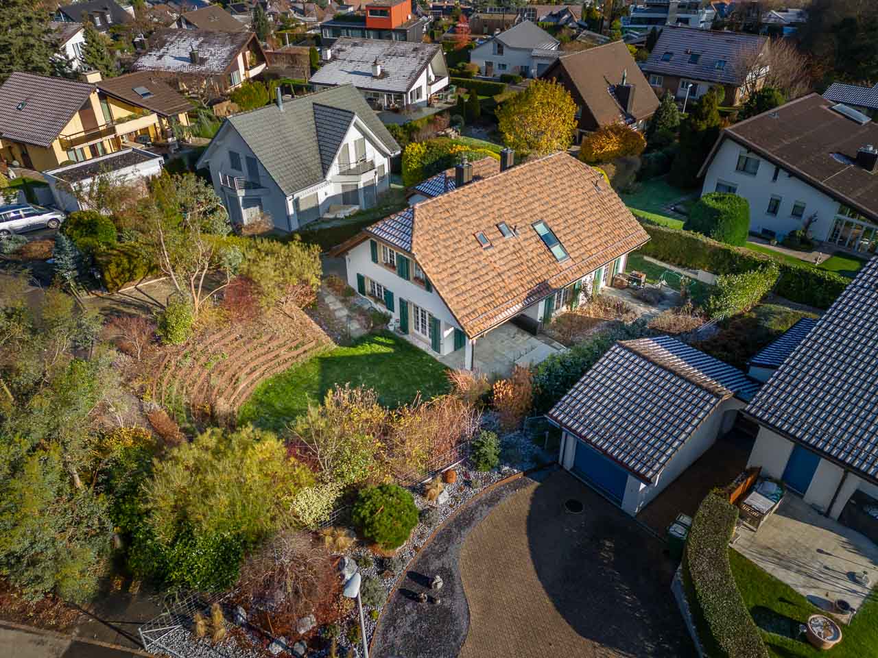 Immobilienfotografie - Einfamilienhaus - Bergdietikon, Aargau. Luftaufnahme mit Drohne